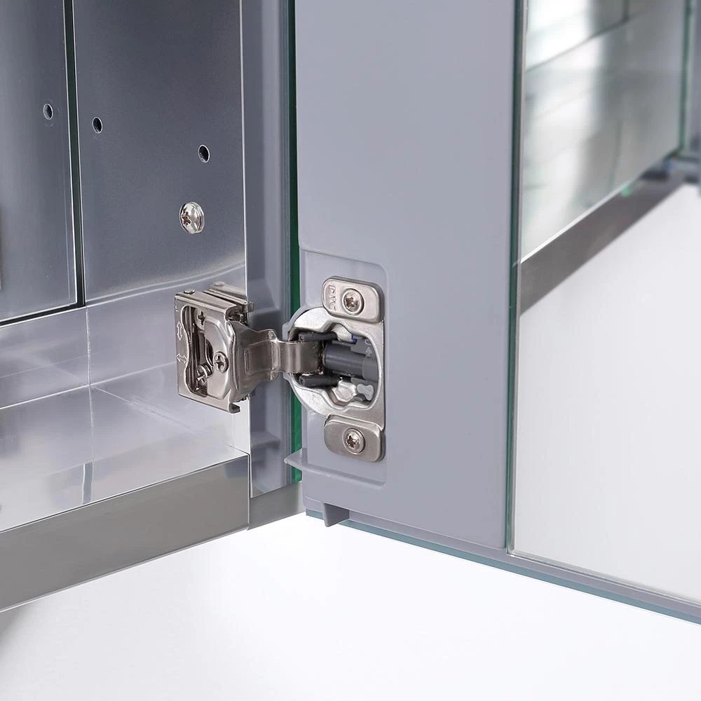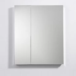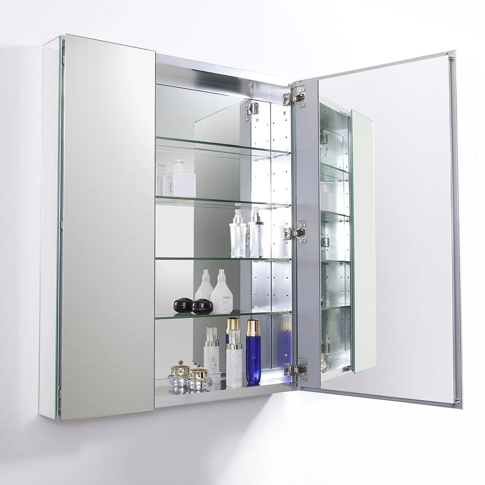 This stylish rectangular bathroom medicine cabinet has a contemporary frameless design. The 2 mirrored doors open to reveal a second mirror at the back of the cabinet and four adjustable glass shelves that can accommodate items of varying heights. An anodized aluminum frame creates a moisture and dust resistant interior.