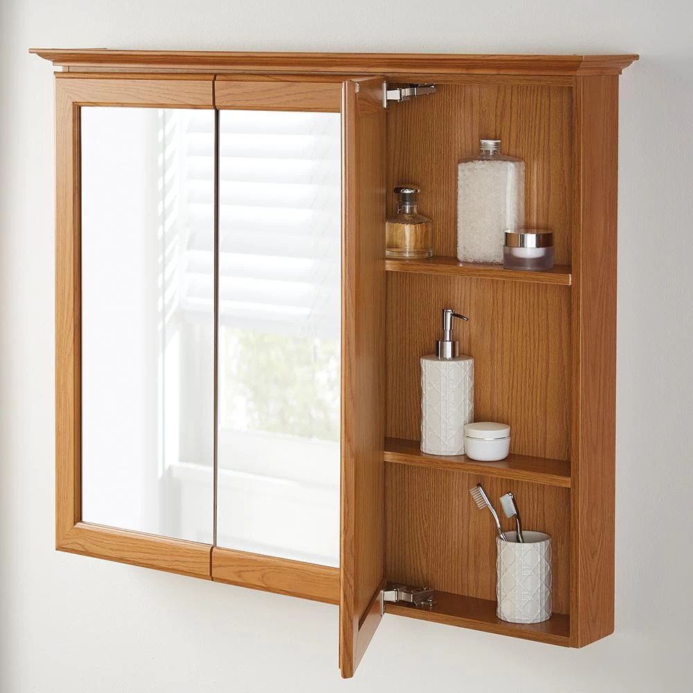 Enjoy safe, affordable fog-free technology with the 36-5/8 in. W x 29-1/4 in. H Fog Free Framed Surface-Mount Tri-View Bathroom Medicine Cabinet in Oak. No more wiping off your mirror or using a hairdryer to remove fog. Featuring ample storage space and decorative crown molding, this cabinet offers a classic look. Constructed with a Wood Composite frame for exceptional strength and durability. The 2 adjustable shelves offer flexibility in storing your toiletries. Double shelf pegs make it quick and easy to customize your space. Fully assembled for your convenience.