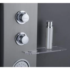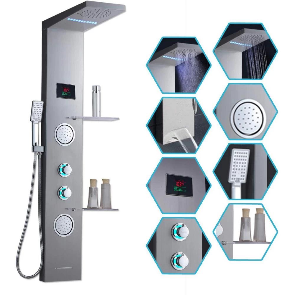- Luxury shower panel has built-in LED temperature display, LED overhead rainfall showerhead, adjustable high-powered body massage jets, tub spout, and high-efficiency multi-function handheld shower wand