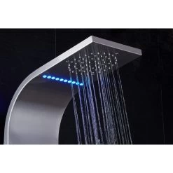 - Luxury shower panel has built-in LED temperature display, LED overhead rainfall showerhead, adjustable high-powered body massage jets, tub spout, and high-efficiency multi-function handheld shower wand