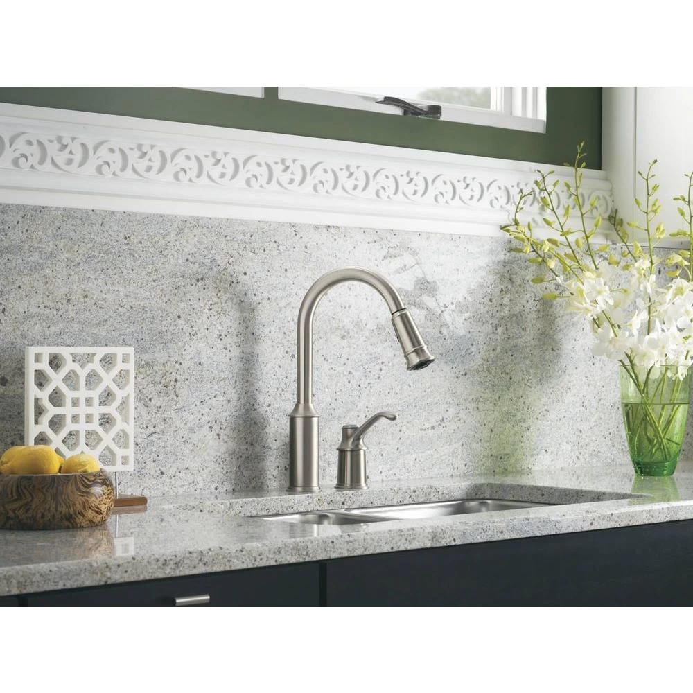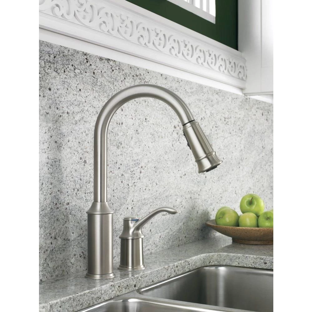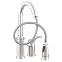 The Aberdeen line from MOEN features a traditional style with surprisingly nimble functionality. Finished in classic stainless to complement today’s popular appliances, the Aberdeen Pull-Down Sprayer Kitchen Faucet features a high-arc, pull-down spout with a one-of-a-kind pause button that allows you to conveniently interrupt the water flow as needed. Aberdeen also utilizes Reflex technology, a system of design enhancements engineered specifically for pull-out and pull-down movement by undocking easily, moving with you and retracting effortlessly when you’re done.