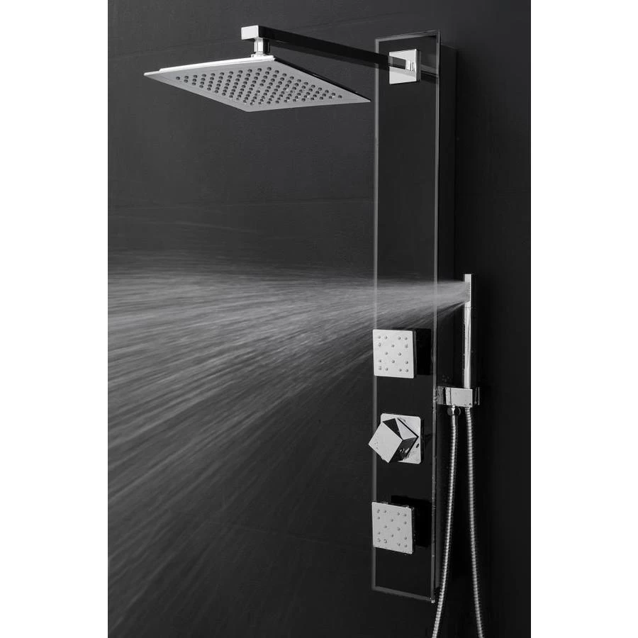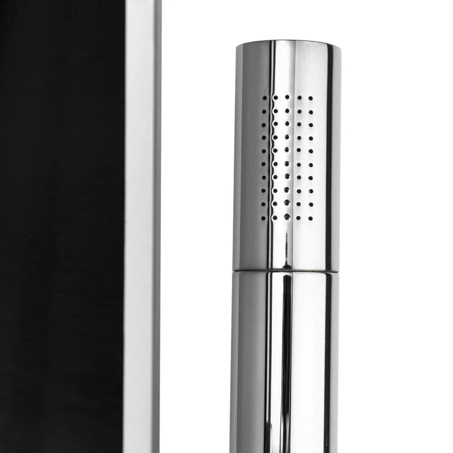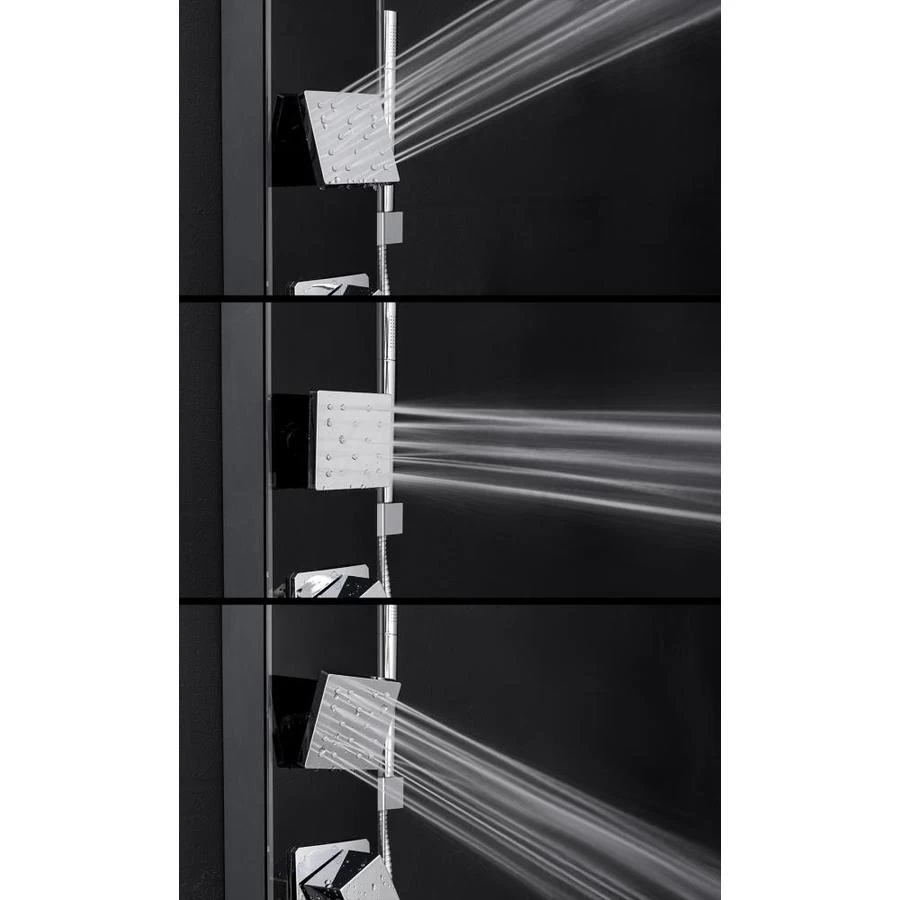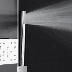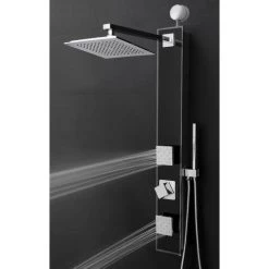 Slimline luxury shower panel has built-in rainfall showerhead, high-powered body spray jets, and high-efficiency handheld shower wand
