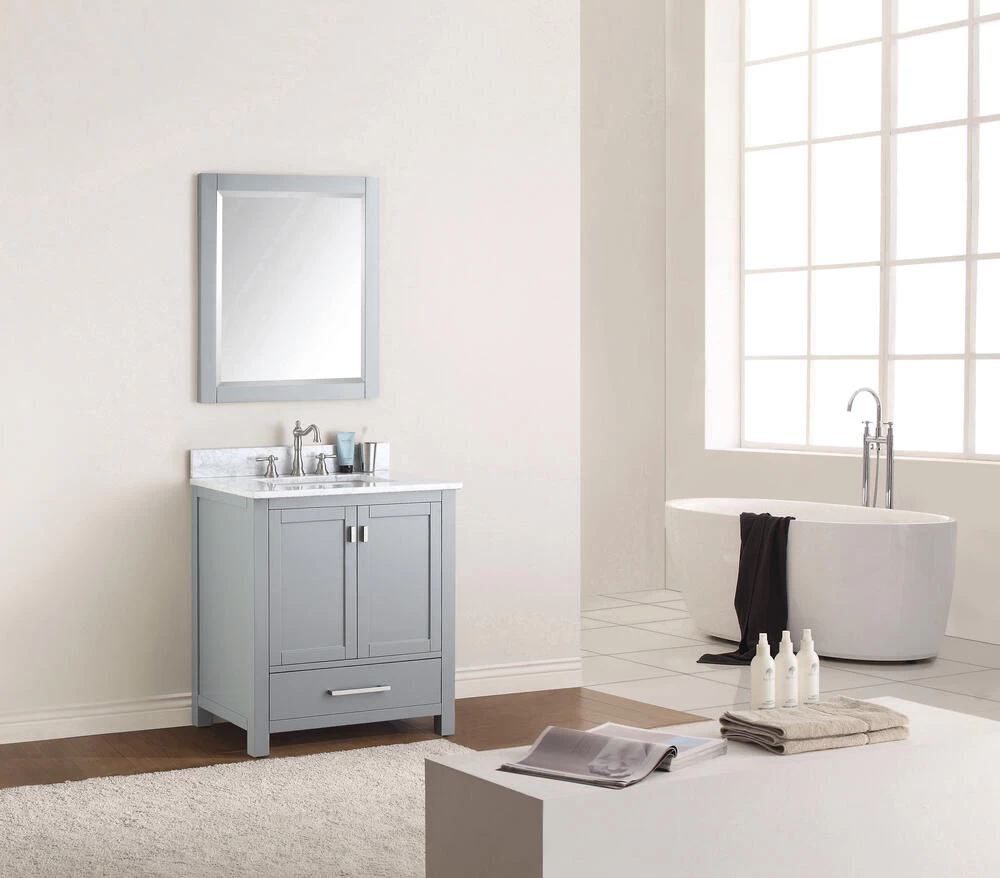 The Modero 24 in. Linen Cabinet has a simple clean design with a Chilled Gray finish and brushed nickel hardware. It is constructed of solid Poplar wood and veneer construction with soft-close doors and drawers that showcase its quality. The Linen Cabinet offers a clear glass door with interior shelves and soft-close drawers for storage.