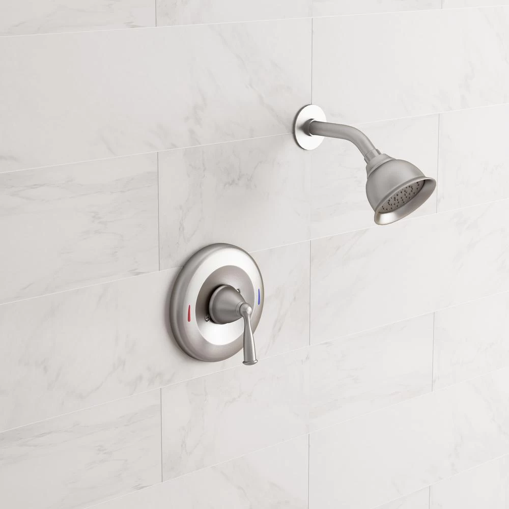 The MOEN Banbury 1-Handle Shower Faucet in Spot Resist Brushed Nickel complements a variety of bathroom decorating styles. The Spot Resist finish avoids fingerprints and water spots for easy maintenance. It features a Posi-Temp pressure-balancing valve that helps maintain the water pressure and temperature. The adjustable temperature limit stop minimizes the possibility of scalding for a safe and comfortable showering experience.