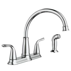The MOEN Brecklyn 2-Handle Side Sprayer Kitchen Faucet in Spot Resist Stainless has a traditional design and works with almost any kitchen decor. With a dual-handle design, you can precisely control the water temperature. It includes a convenient side sprayer, ideal for washing large pots and pans, and rinsing the sink down afterwards.