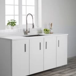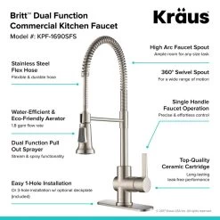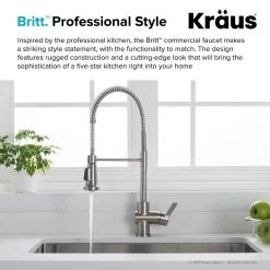 Inspired by the design of a professional kitchen, the Britt commercial faucet blends performance and style to help you build the kitchen of your dreams. The sleek contemporary design features a flexible, commercial-style open coil spring spout with stainless steel hose and secure docking arm. The dual function sprayhead with large non-slip rubber button switch allows you to easily shift between 2 functions, with an aerated stream for everyday cleaning, and a powerful spray for heavy-duty rinsing. Soft rubber nozzles make the sprayface easy to clean and maintain a lasting powerful flow. Available in all-Brite Spot Free Stainless Steel finish, which helps to prevent fingerprints and requires less cleaning.
