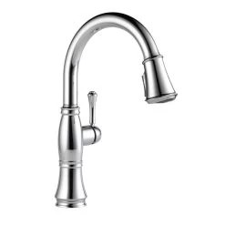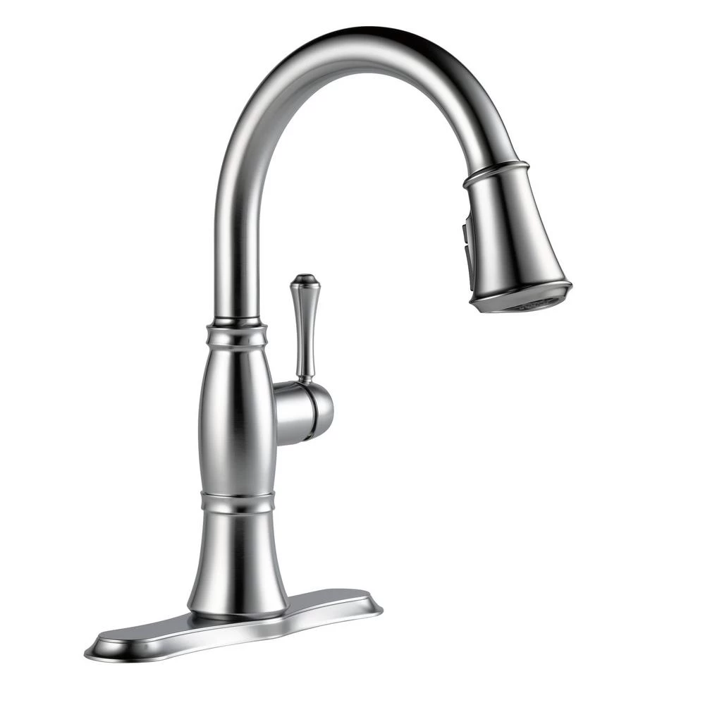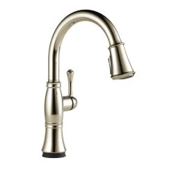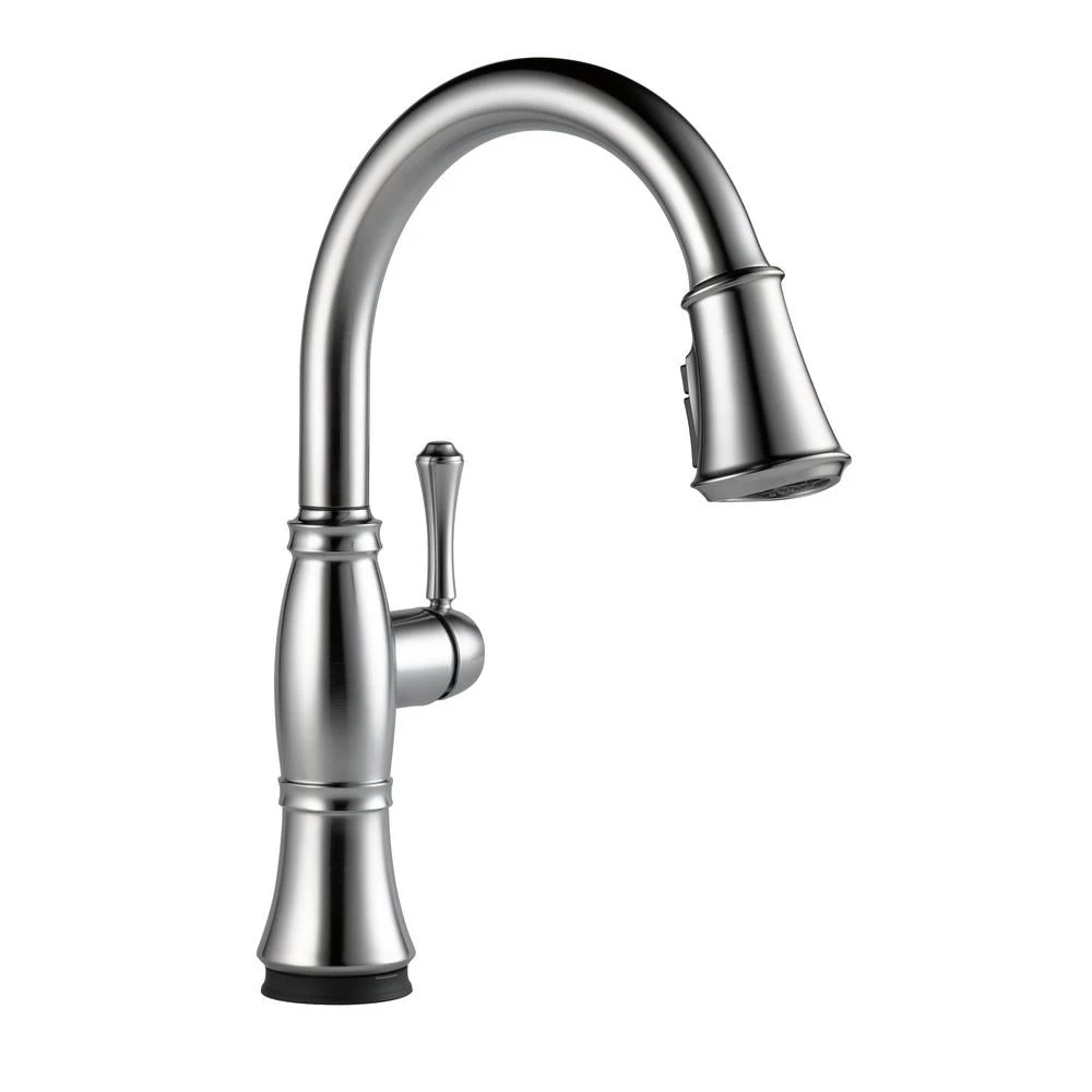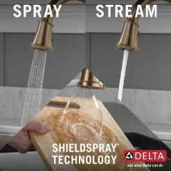 Whether you have two full hands or 10 messy fingers, Delta Touch2O Technology helps keep your kitchen faucet clean, even when your hands aren’t. A simple touch anywhere on the spout or handle with your wrist or forearm activates the flow of water at the temperature where your handle is set. The Delta TempSense LED light changes color to alert you to the water’s temperature and eliminates any possible surprises or discomfort. Kitchen sink faucets with Touch-Clean Spray Holes allow you to easily wipe away calcium and lime build-up with the touch of a finger. Delta ShieldSpray Technology cleans with laser-like precision while containing mess and splatter. A concentrated jet powers away stubborn messes while an innovative shield of water contains splatter and clears off the mess, so you can spend less time soaking, scrubbing and shirt swapping. Delta Lumicoat Finishes easily wipe clean without the need for cleaners or chemicals and are guaranteed to resist mineral buildup and hard water stains. The ultra-sleek surface repels liquids, resisting water spots and staying cleaner longer, so your faucet stays beautiful. Delta kitchen faucets with DIAMOND Seal Technology perform like new for life with a patented design which reduces leak points, is less hassle to install and lasts twice as long as the industry standard. Electronic parts are backed by our 5-year electronic parts warranty.