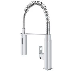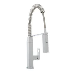 Developed in response to the rising number of home chefs who prefer commercial-grade function, new Eurocube encompasses a striking 100% cubic design and quality professional features. The pull-out spray head mounted on a spring hose has 360 movement, while the toggle spray function allows for seamless switching between regular water flow and spray without turning off the water. The durable and attractive StarLight finish ensures a scratch and tarnish-free surface for a lifetime.
