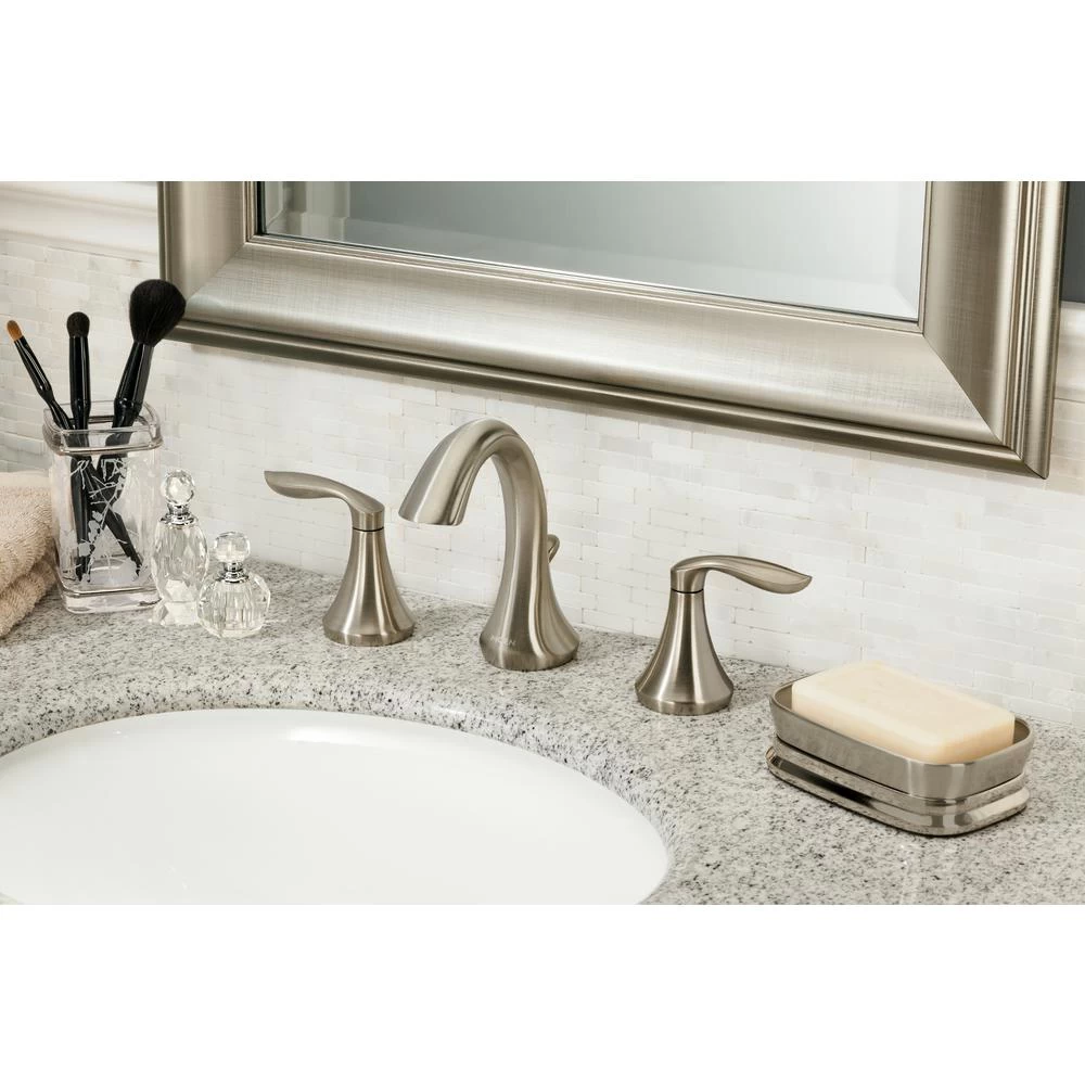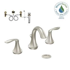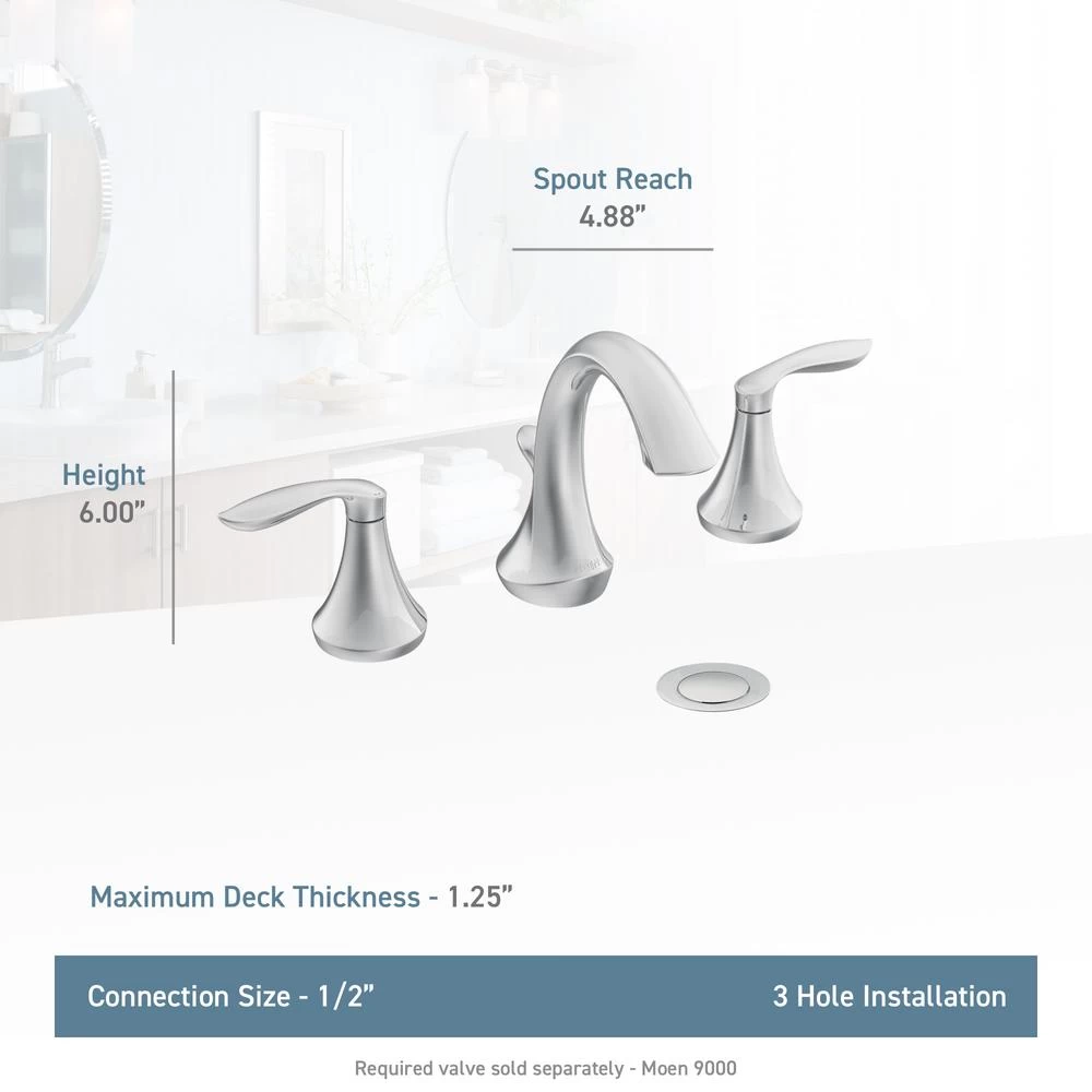 Featuring flowing curves, the MOEN Eva 8 in. Widespread 2-Handle Bathroom Faucet Trim Kit will add an upscale look to your bathroom. Boasting a beautiful brushed nickel finish that brings the warm look of stainless to your decor, this faucet offers petal-like handles and a swan-like spout to bring a relaxed, luxurious feeling to your space. Includes valve 9000 for installation.