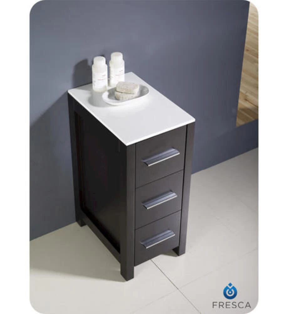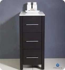 This side cabinet comes in an espresso finish. It has 3 spacious drawers and a sleek ceramic countertop. Perfect match for all Fresca Torino “espresso” vanities.