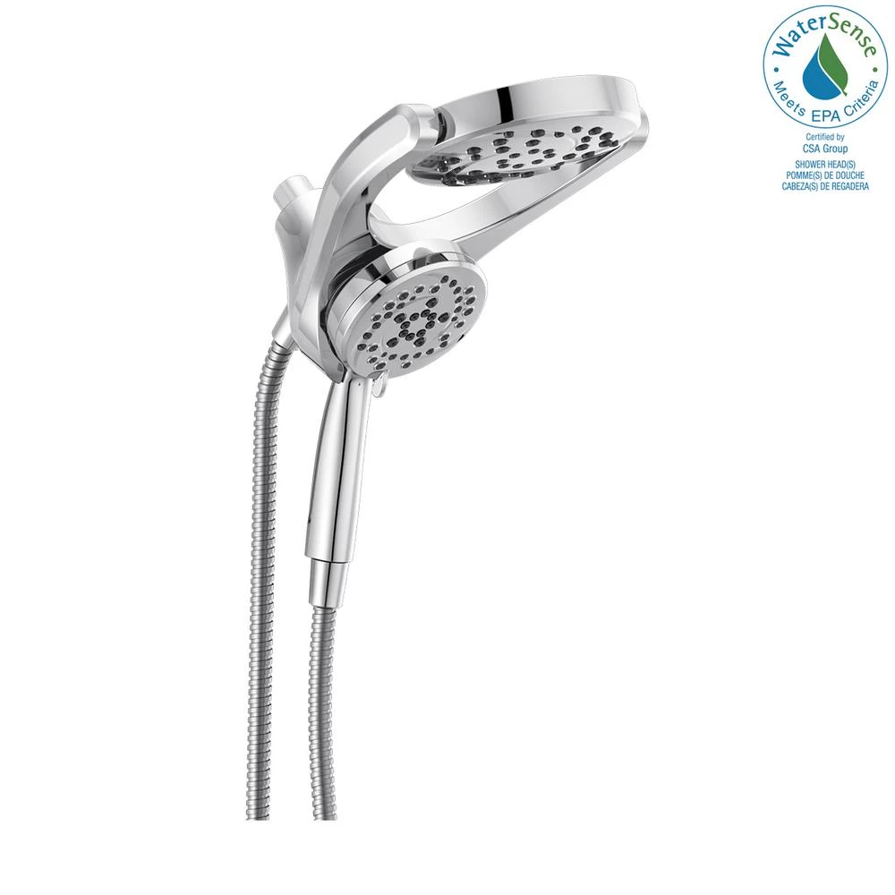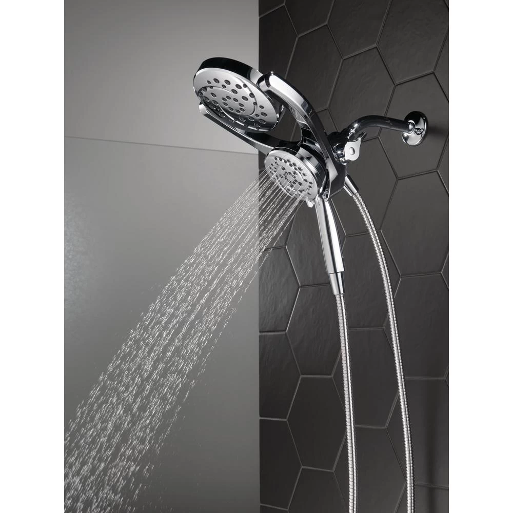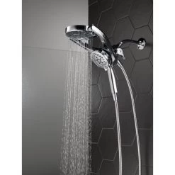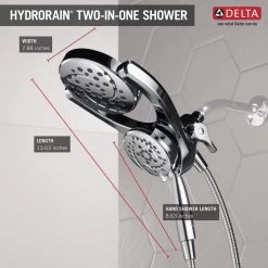 Designed to fit a standard shower arm, the HydroRain Two-in-One Shower Head with Hand Shower installs in minutes. Once installed, it provides you with a luxurious shower experience and complete control over your water with a pivoting rain can and the option to use the rain can on its own, the hand shower on its own, or both together. While other products may gather unsightly mineral build-up over time, Delta soft rubber Touch-Clean spray holes allow any mineral residue to simply be wiped away for an instantly refreshed look with no need for soaking or the aid of chemical cleaners. The pause setting gives you ample space for shaving, lathering and other shower tasks, without worrying about overspray or water waste. This spray setting helps you conserve water, so you can worry less about depleting your supply of hot water – and you help the environment too. Delta Water Sense labeled faucets, showers and toilets use at least 20% less water than the industry standard saving you money without compromising performance.