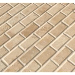 Whether you use these MSI Tuscany Ivory Honed Travertine Mosaic Wall Tiles indoors or outdoors they are stylish and complement any design scheme. They measure 2 in. x 4 in. and have random variations in tone with beveled edges. They are installed on a 12 in. x 12 in. mesh sheet that makes installation an easy process. These tiles are highly skid-resistant and constructed from durable travertine material and features a semi-vitreous water absorption. When using natural stone products, it is recommended to blend tiles from different boxes when installing. After installation, vendor disclaims any liabilities. Natural stones may be characterized by dry seams and pits that are often filled. The filling can work its way out and it may be necessary to refill these voids as part of a normal maintenance procedure. Natural stone products inherently lack uniformity and are subject to variation in color, shade, finish, etc.