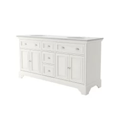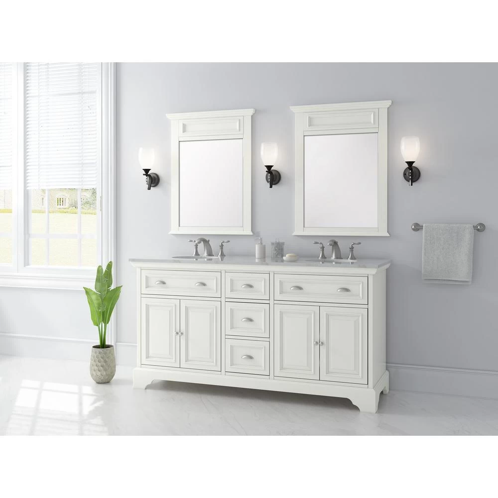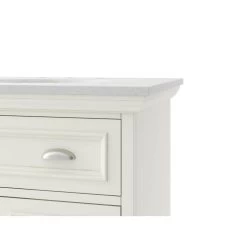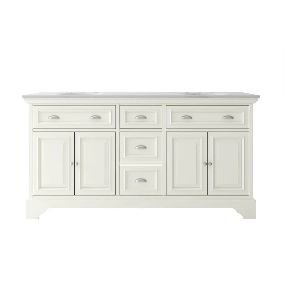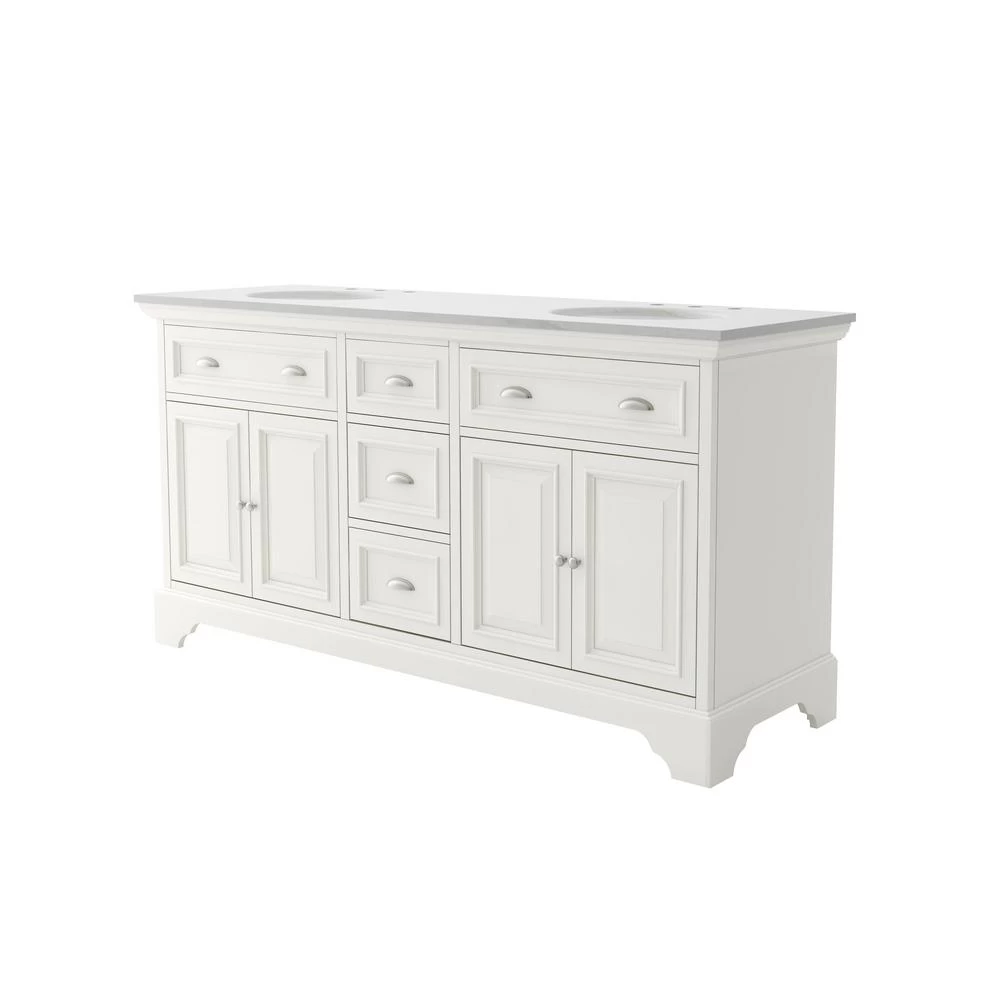 Featuring twin sinks, a column of drawers, and an adjustable shelf behind each pair of doors, the Sadie Double Vanity is a master suite must-have. With its subtly classic design features and dove grey finish, this vintage-inspired bathroom vanity brings functional storage plus luxury and charm to your space. A wide vanity top made of natural marble provides ample room for your morning prep essentials. Any swirling or veining you notice indicates the natural beauty of the stone and has no impact on its function or durability.