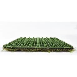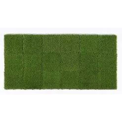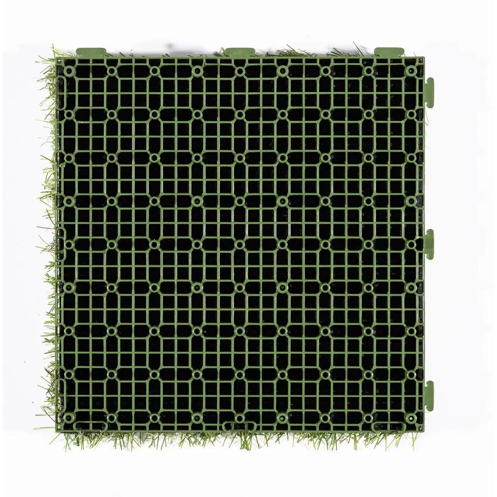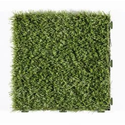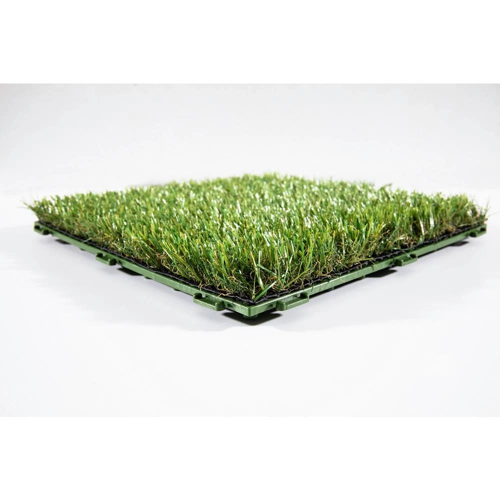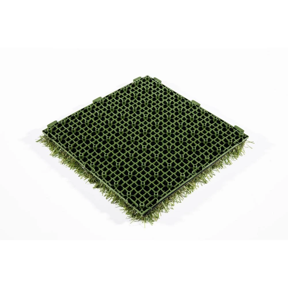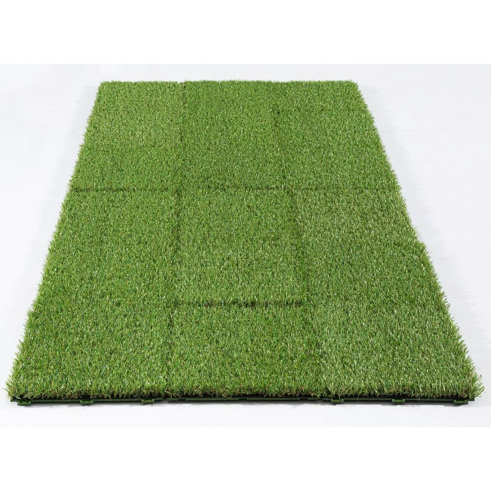 Traffic Master Artificial Grass 12 in. x 12 in. 9 Piece Set Interlocking tiles make an easy Do It Yourself project. Great for any outdoor setting whether for patio, deck, balcony, outdoor kitchen, poolside, gazebo, basements, etc. the options are endless. Features a durable polyethylene pile with a polypropylene thatch, as well as drain holes for quick and easy draining perfect for outdoor use. Grass pile is approximately 1 tall and upon removing tiles from box, be sure to brush the pile by hand to speed up the opening and relaxation of the yarn bringing this product to its natural state. 1 set (9 tiles) make a perfect square, 2 sets would make a rectangle or L-Shape, the choice is yours as interlocking tiles offer endless options. Be sure to watch our videos and all the product images for visual reference points.