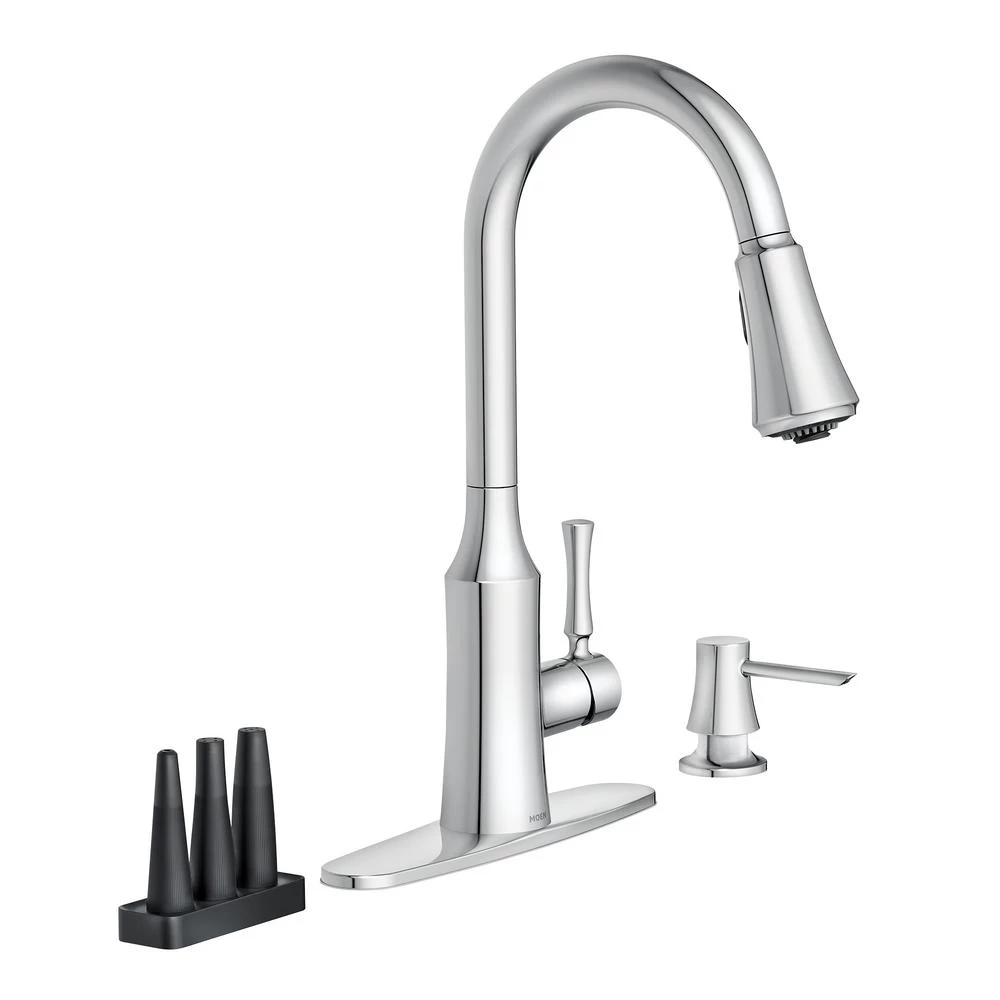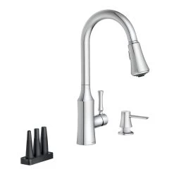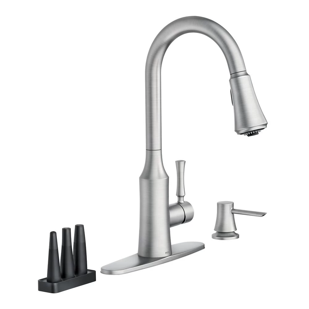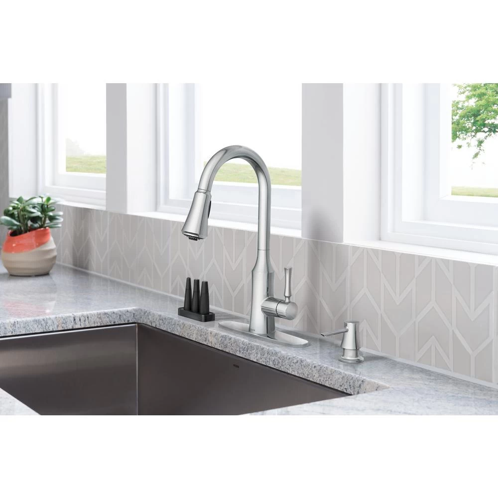 The timeless yet fashion-forward design of the Venango pulldown kitchen faucet offers a flexible, detailed look that is complementary to a variety of kitchen styles. The fixture features MOEN’s Power Clean spray technology, which cleans 50% faster than MOEN faucets without the technology, and includes 3 additional Power Clean attachments to provide multiple, focused spray options for hard-to-clean items. It also comes equipped with MOEN’s Reflex system to ensure smooth operation and secure docking of the spray wand, as well as a matching soap dispenser for a coordinated appearance.