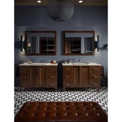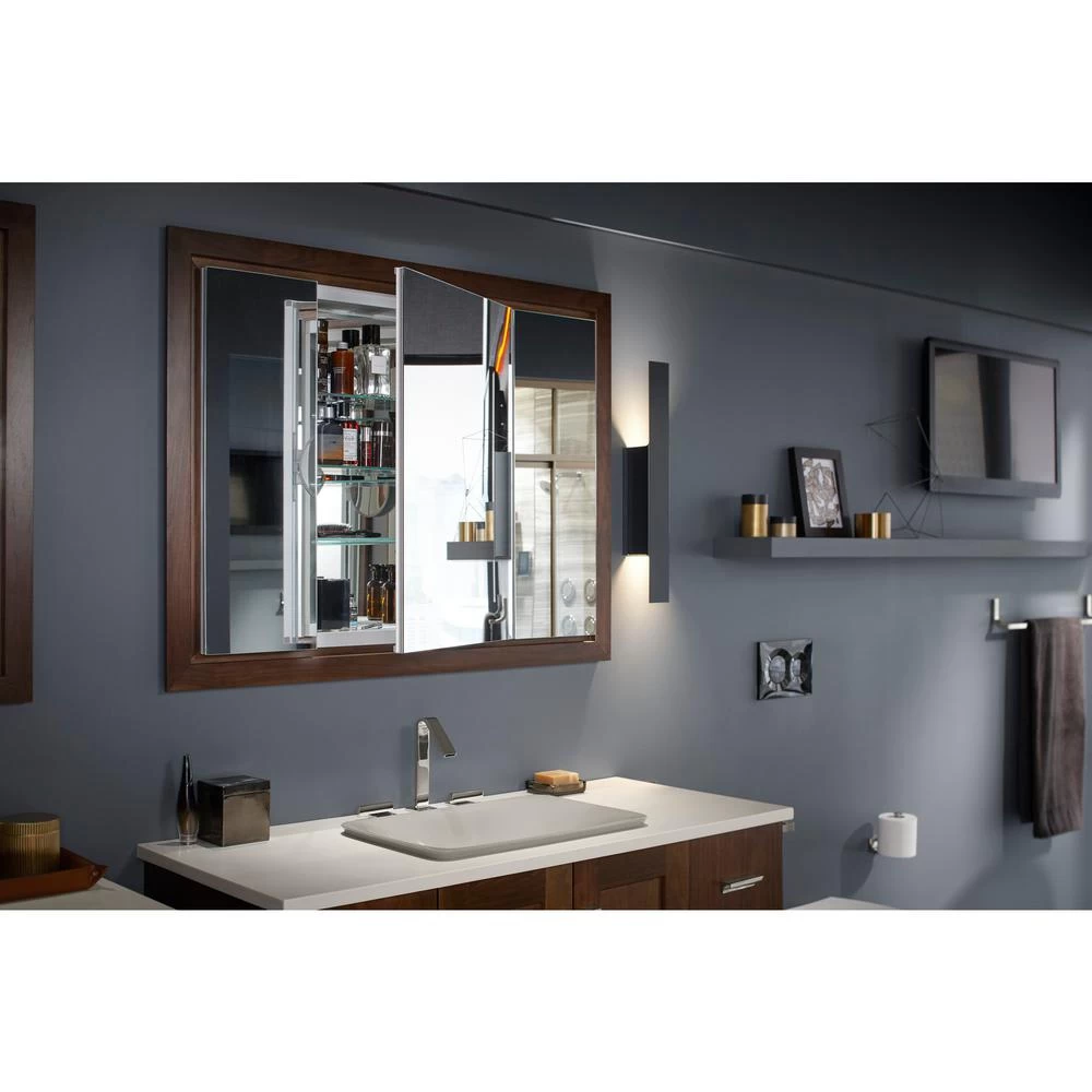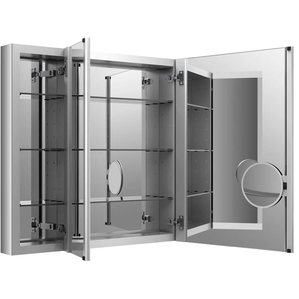 The Verdera medicine cabinet combines an elegant fit and finish with quick, easy installation. Triple mirrored doors create a light-filled gallery effect, opening to a fully mirrored interior with three adjustable glass shelves. A built-in magnifying mirror on the inside of the door is vertically adjustable to accommodate users of varying heights. Slow-close doors create a quieter bath environment.