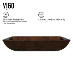 The vibrant hues of the VIGO Rectangular Russet Glass Bathroom Sink Set with the Seville Vessel Faucet add remarkable dimension to any bathroom. The sink is made of durable, tempered glass to resist dangerous breakage and hand painted, making each sink supremely unique. The sink is paired with the 7-layer coated, solid brass constructed Seville Vessel Faucet. Its material resists corrosion, tarnish and rust, rending it long lasting for years of use. A matching, complementary pop up drain completes this all-in-one set.