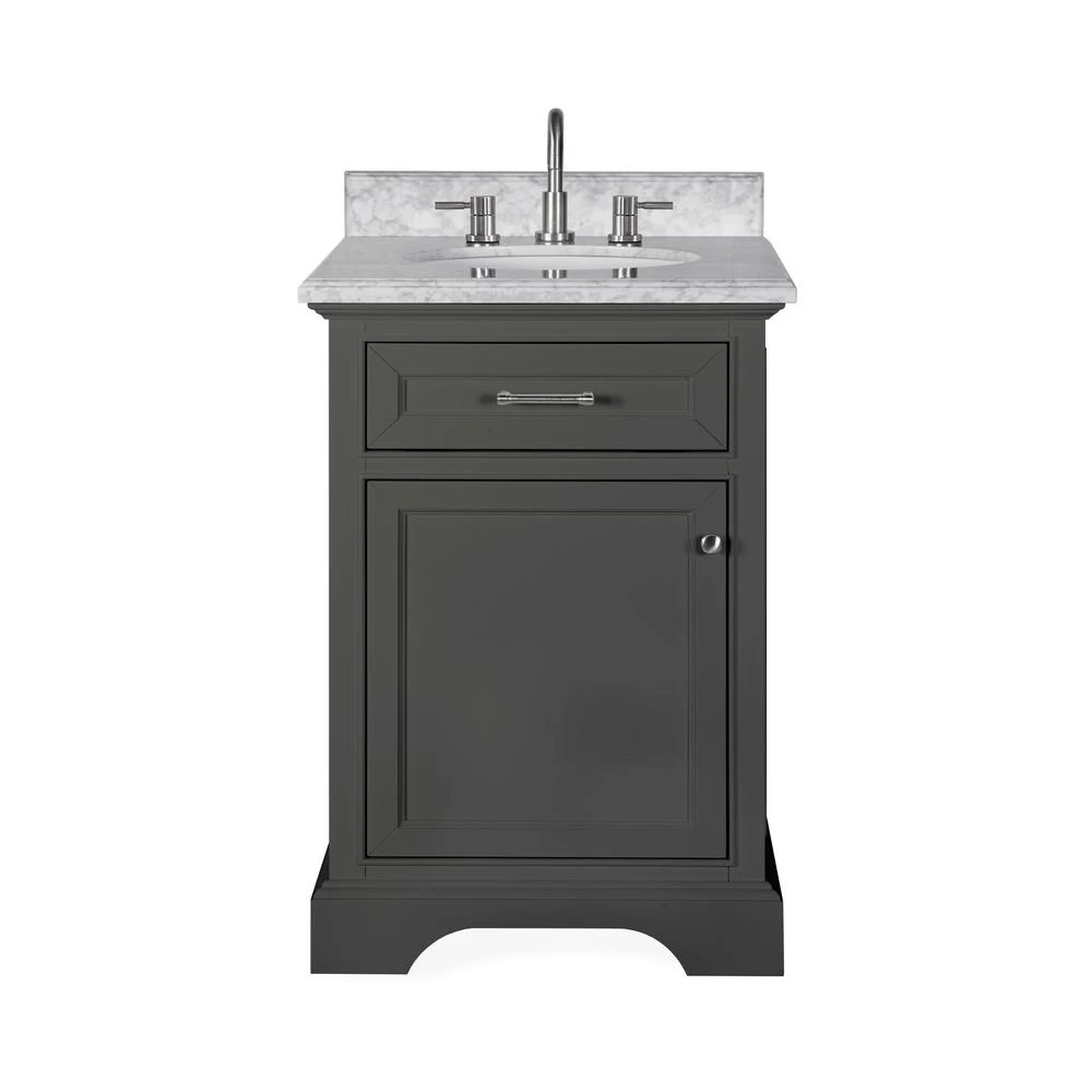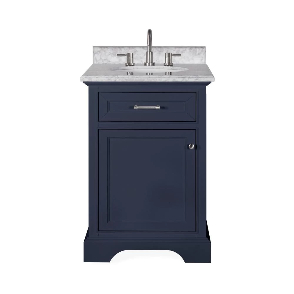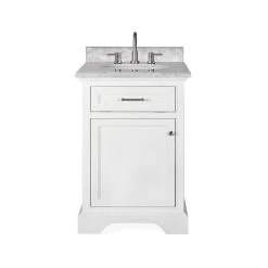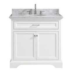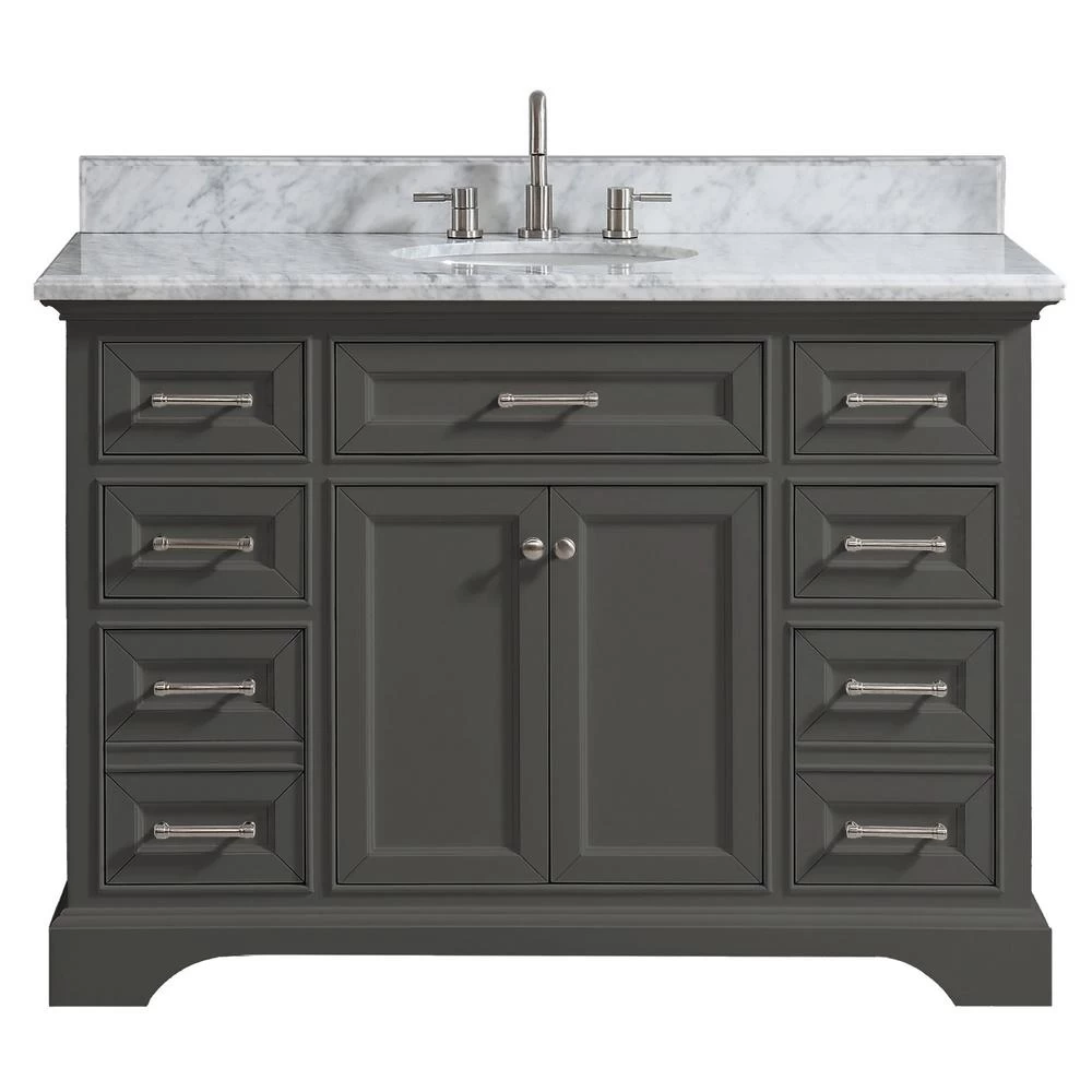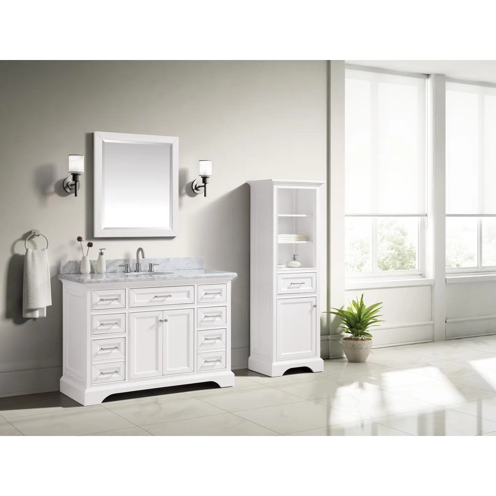 The white finish on the Windlowe 49 in. W x 22 in. D x 35 in. H Bath Vanity Carrara Marble Vanity Top will blend into any existing décor style scheme. The durable wood that it is constructed with is easy to clean and the surface is ample enough to store personal items. This vanity blends contemporary and traditional styles and is sure to bring a timeless touch to your home.