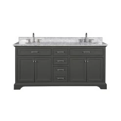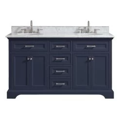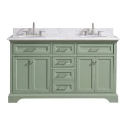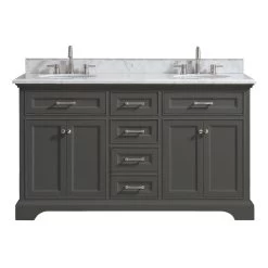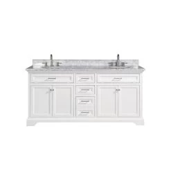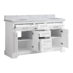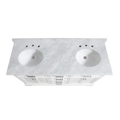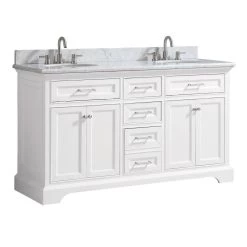 The Windlowe Collection features classical design enhanced by a soothing White finish, creating an aesthetic that mixes flair and function. The Windlowe 61 in. double vanity showcases its quality and style with a solid wood frame, Brushed nickel hardware and soft-close hinges and glides. The vanity combo includes a Carrera white marble top and 2 white vitreous china undermount oval sinks.