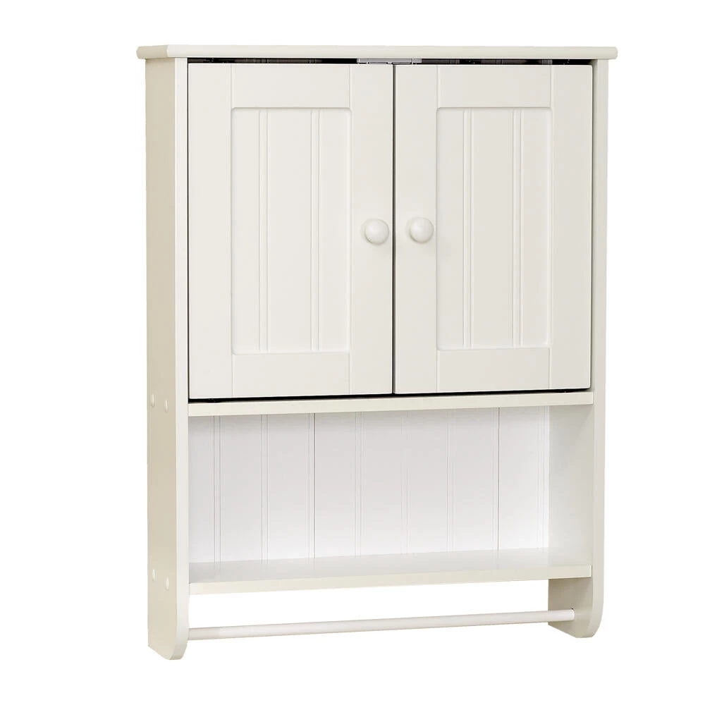 The 2-Door Country Cottage Wall Cabinet adds valuable storage to any bathroom with limited floor space. This attractive and functional cabinet has both open and hidden storage. A full-length towel bar is included for bathroom towels. The cabinet is easy to assemble and install. Wall mounting hardware is included.