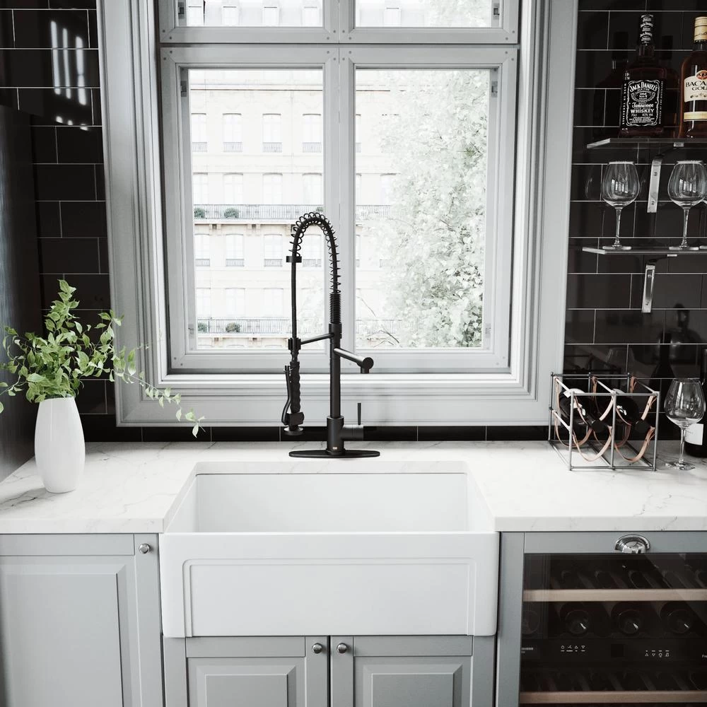 The VIGO Zurich Pull-Down Spray Kitchen Faucet features a pull-down spray head that can extend up to 28 inches, along with a separate pot filler, making it highly functional in any kitchen. This single hole, single lever faucet is constructed from durable solid brass and features a 7-layer plated finish for durability and longevity. Its easy grip handle makes it ideal for use in both residential and commercial kitchens. This faucet includes a matching matte black deck plate to allow for it to be installed with 1,2,3, or 4-hole hole installations.